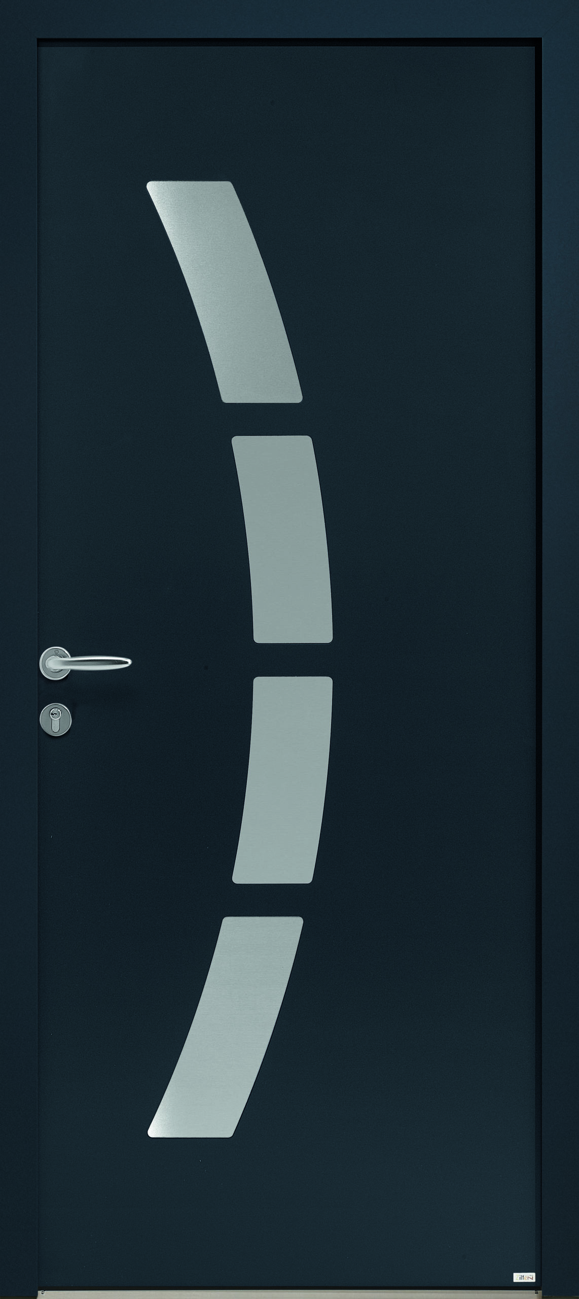 La porte d'entrée Cytiss 2 est l'alliance de la qualité d'une porte en aluminium et d'un budget maîtrisé. Son décor en inox est semi circulaire.